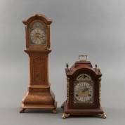 Miniatuur staand horloge en een tafelklokje, beide met adres John Smith, Londen, 20e eeuw -beelden van horloge incompleet, maar wel bijgevoegd, slingerveer van tafelklok afgebroken-, hoogte staand horloge 45 cm
