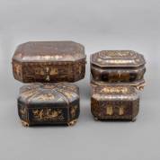 Vier diverse Chinese lakwerk kistjes, waaronder één naaikist, 19e eeuw -gouddecors op deksel vervaagd-, grootste 12 × 32 × 23 cm