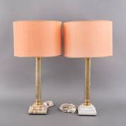 Paar tafellampen met gecanneleerde messing stammen, vierkante trapsgewijs opgebouwde natuurstenen voeten, en rode kappen -gebruikssporen en kleine beschadigingen-, 77 × Ø 42 cm