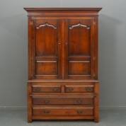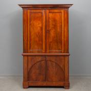 Mahonie vierdeurs kast, de bovenkast met schappen, de onderkast met brede ondiepe lades, biedermeier -taperest op rechter zijkant, kleine defecten en herstellingen aan profielen en hoeken-, 187 × 121 × 59 cm