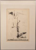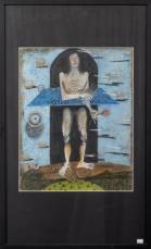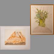 Marjanne de Boer (modern), twee werken: figuur in magische vrucht, gemengde techniek, 80 × 60 cm, en compostie van figuren in bruine gewaden, potloodtekening, 47 × 63 cm, geen van beide gesigneerd