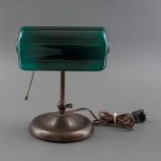 Bronskleurige metalen bibliotheeklamp met groene glazen kap, gemerkt Verdelight, VS -bedrading dient vervangen te worden-, hoogte circa 30 cm