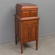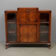 Wortelnotengefineerd wandkastje met klep, twee beglaasde deuren en een dichte deur, Engeland, laat 19e eeuw -gebruikssporen, kring op bovenblad-, 114 × 122 × 26 cm
