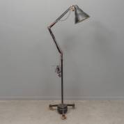 Doorleefde industriële lamp met scharende arm op verrijdbaar onderstel -fitting bungelt los in kap-, circa 150 × 70 cm