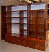 Bruingebeitste esdoorngefineerde kastwand, met deurtjes, lades, beglaasde deurtjes en open vakken -lichte gebruikssporen, geheel demontabel-, 219 × 284 × 58 cm
