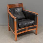 Fauteuil met zwarte lederen bekleding en houten frame, model Rennie, uitvoering Schuitema -verkleurd-