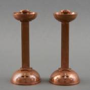 Paar gehamerde koperen kerkkandelaars, ontwerp en uitvoering Frans Zwollo junior (1896-1989), in eigen atelier, Oosterbeek, gemerkt, hoogte 21 cm