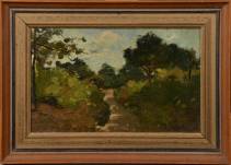 Geo Poggenbeek (1853-1903), bospad, olieverf op board, r.o. gesigneerd met stempel: Atelier Poggenbeek, 15,5 × 25 cm