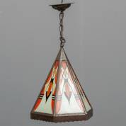 Hexagonaal plafondlampje met koperen montuur en zes gebrandschilderde ruitjes, Amsterdamse School -beetje verfverlies-, exclusief ketting 35 × 25 × 25 cm