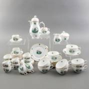 Porseleinen koffie- en theeserviesgedeelte met decor van een paartje in landschap, uitvoering Fürstenberg, Duitsland, bestaande uit: koffiekan, suikerpot, roomkan, 13 koffiekop-en-schotels, acht theekop-en-schotels, en 12 taartbordjes, hoogte koffiepot 18,5 cm