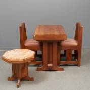 Eiken ameublement, bestaande uit: paar stoelen, kleine tafel met vak onder het blad, en bijzettafeltje met natuurstenen blad -blad gebroken-, Utrecht, jaren '30, tafel 76 × 92 × 60 cm