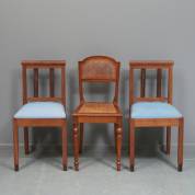 Paar mahonie stoelen met coromandel accenten, art deco -gebruikssporen en kleine defecten-, daarbij: notenhouten stoel met rietbespanning in de zitting en de rug, uitvoering Horrix, Den Haag, begin 20e eeuw -zitting aan vervanging toe-