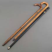 Drie diverse mijnopzichters- of geologenstokken, waarvan één met reliëfdecor op het bijltje, alle circa 1900, langste 93 cm