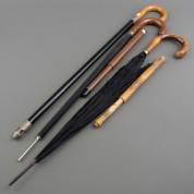 Drie wandelstokken: twee met daarin paraplu's, de ander met lampje in de ferrule, langste 89 cm