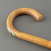 Hazelnoten wandelstok met glazen bol, deze tevens te gebruiken als vergrootglas, messing hals en kraag als greep, lange messing ferrule met ijzeren eindstuk, 19e eeuw, lengte 104 cm
