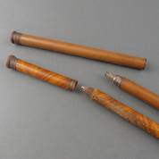 Twee wandelstokken met in de stam verborgen drankflacons, tweede helft 19e eeuw -bij beide schroefdraad wat sleets, gebruikssporen-, 93 en 89 cm lang