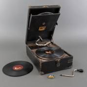 Reisgrammofoon in zwarte draagkoffer, model 101, uitvoering His Masters Voice, jaren '20 -speelt-, maat open 50 × 29 × 45 cm, met acht platen