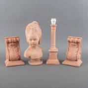 Divers rood aardewerk: twee consoles, lampvoet in de vorm van een zuiltje, en buste van een meisje, laatstgenoemde 40 × 25 × 18 cm