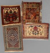 Vier kleine Perzische tapijtjes, waaronder Afshar en Hamadan, grootste 62 × 44 cm