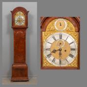 Engels staand horloge in notengefineerde kast, het uurwerk met slagwerk en datum, Romeinse uuraanduiding, inclusief twee gewichten, slinger en sleutel, 18e eeuw, -stukje fineer ontbreekt-, 215 × 51 × 26 cm