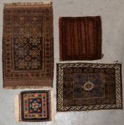Vier Perzische tapijtjes, waaronder Belouche, grootste 100 × 63 cm