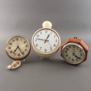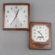 Twee wandklokken in houten kasten, een werkend op batterij, adres: Manufacture Francaise d'Armes et Cycles, Saint-Etienne, Frankrijk, art deco, de ander op stekker, adres Mauthe Synchron, circa 1960 -kleine defecten, niet getest-, grootste 33 × 33 cm
