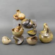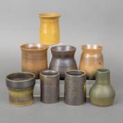 Acht moderne keramische vaasjes met bruingroen glazuur, alle gesigneerd MH, eind 20e eeuw, grootste exemplaar circa 11 cm hoog