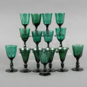Verzameling van drie diverse series geslepen groene wijnglazen, in totaal 15 stuks, 19e eeuw, de hoogste 14,3 cm