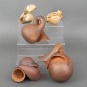Collectie van vijf bruin geglazuurde aardewerk sculpturen, niet gesigneerd, grootste 22 cm hoog