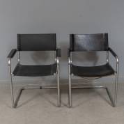Twee diverse verchroomde buisframe armstoelen met zwarte bekleding, in de stijl van Mart Stam