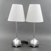 Paar aluminium tafellampen met witte kappen, model Madonna, ontwerp Jan des Bouvrie, uitvoering Quasar, hoogte voet 60 × Ø 23 cm