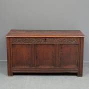 Eiken panelenkist, de gesneden regel in het front met wijnrankdecor, 18e eeuw -enkele bodemdelen los maar aanwezig-, 67 × 120 × 51 cm