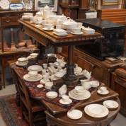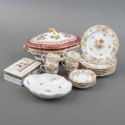 Aardewerk diner- en ontbijtserviesgedeelte, model Edme, uitvoering Wedgwood, Engeland, bestaande uit: tien dinerborden Ø 26 cm, zes kleine dinerborden Ø 23 cm, acht diepe borden Ø 23 cm, negen kleine diepe borden Ø 20 cm, negen ontbijtborden Ø 20 cm, grote en kleine terrine, slaschaal, sauskom op voet, drie ovale dienschalen, peper- en zoutvaatjes, acht dessertbakjes, ovenschaal, zes soepkommen op onderschotel, koffiepot, theepot, mokkapot, melkkan, suikerpot, twee suikerschaaltjes, roomkannetje, twee broodschalen, negen eierdoppen, elf koffiekoppen met schotels, tien espressokopjes met drie schotels, acht theekoppen met schotels, negen kleine bakjes, vier kleine bordjes, vier kleinere bordjes, zes petit-fourbordjes, taartschaal met negen grote en acht kleine taartbordjes, cakeschaal, paar tafelkandelaars, en twee asbakken -chipjes van botervloot, enkele minieme chips-, diverse formaten