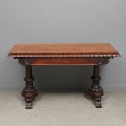 Notenhouten schrijftafel met bladdecor, op zuilvormige poten, 19e eeuw -watervlek op poot-, 75 × 140 × 65 cm
