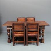 Donkergebeitste eiken tafel, de gesneden regel onder het blad met wijnrankdecor, en vier eiken stoelen met lederen bekleding, tweede helft 20e eeuw -lichte gebruikssporen op blad-, 76 × 183 × 90 cm