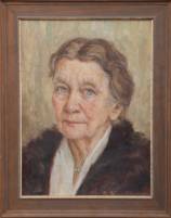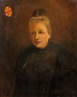 Hollandse School: portret van oudere dame met links bovenin het familiewapen Hooft Graafland, olieverf op doek, l.o. onduidelijk gesigneerd, begin 20e eeuw -beschadigingen, gat-, 66 × 52 cm