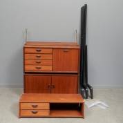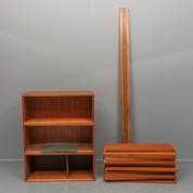 Diverse onderdelen voor een systeemkast, model Royal System, ontwerp Poul Cadovius, uitvoering CADO, bestaande uit: achttien plankjes, drie kastjes, en drie muurbeugels -defecten, ophangbeugels ontbreken, deurtje van één kastje mist-