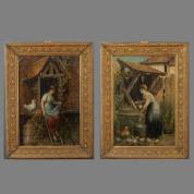 Twee reproducties in lijst: 'Eieren rapen' en 'water halen', 19e eeuw -beschadigingen-, 65 × 45 cm