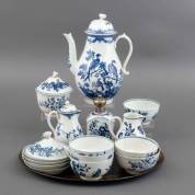 Diverse soft paste koffie- en theeserviesdelen met blauw-witte vogel- en bloemdecors, Worcester, Engeland, 18e eeuw -enkele barsten, chips, en teruggelijmd greepje-, daarbij: lakwerk dienblaadje -sleets-