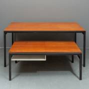 Twee tafels met teakfineer bladen en zwart stalen frames: salontafel model TU04, 46 × 119 × 63 cm, en eettafel, model TU11, 71 × 157 × 80 cm, beide ontwerp Cees Braakman, uitvoering Pastoe -beide met zware gebruikssporen-