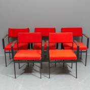 Vijf armstoelen met oranje bekleding, de zwart stalen frames met afrormosia armleggers, uitvoering Pastoe, onderop gestickerd -slechte conditie: één poot beetje verbogen, één armlegger ontbreekt, lichte corrosie op frames, en andere slijtages-