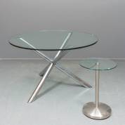 Ronde glazen halfhoge tafel met buisframe onderstel, daarbij: een rond glazen bijzettafeltje op geborsteld rvs poot, beide modern, grote tafel 70 × Ø 119 cm