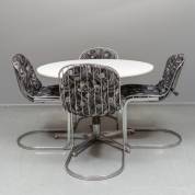 Vier draadstalen stoelen, de stoffen kussens met bloemdecor -kussens met defecten-, daarbij: een ronde formica tafel op centrale zwartgelakte en verchroomde poot, alle jaren '70/'80, maat tafel 71,5 × 107 cm