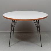 Ronde eettafel met formica blad en uitschuifbaar zwart metalen onderstel, ontwerp Rudolf Wolf, uitvoering Elsrijk -een poot heeft een lichte roestplek aan de onderkant- 72 × 110 Ø cm