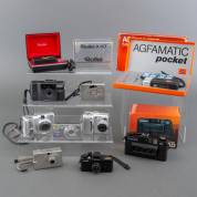 Tien diverse analoge en digitale camera's, waaronder: Rollei A110, Agfa Agfamatic 508, en Nimslo 35mm 3D camera