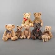 Clemens: bruine mohair en zes lichtbruine mohair teddyberen, en kleine olifant, uitvoering Clemens Spieltiere, GmbH, Duitsland, vierde kwart 20e eeuw, bruine beer 40 cm