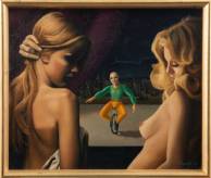 Hans Bogaarts (1948), magisch realistische voorstelling met man op eenwieler en naakte vrouwen, olieverf op board, r.o. gesigneerd en gedateerd '74 -craquelé-, 24 × 29 cm
