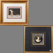 Ingekleurde gravure: Cupido op wagen voortgetrokken door twee slakken, reproductie van een fresco van Raphaël voor de stufetta van kardinaal Bibbiena, Italië, 18e/19e eeuw, 13,5 × 18,5 daarbij: ingekleurde gravure: neoclassicistisch portret van man met hoorn gevormd als letter 'C', Italië, 19e eeuw, 13,5 × 15 cm