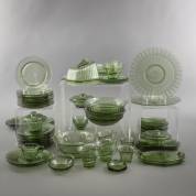 Groen persglazen ontbijtserviesgedeelte, model Neerlandia, ontwerp Andries Dirk Copier, 1939, uitvoering Glasfabriek Leerdam, bestaande uit: 20 borden Ø 20 cm, negen kopjes, roomstel, vele kommen en divers ander dienservies -hier en daar een randchipje-