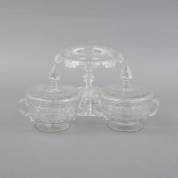 Paar kristallen dekselpotten met oren, vermoedelijk uitvoering Waterford, en een tazza met gecontourneerde rand en octagonale voet -alle met gebruikssporen en chipjes-, tazza 14 × Ø 22,5